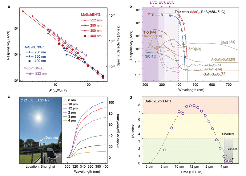 1. (a)势垒调控的紫外光探测器响应率、探测率与入射光强的关系;(b)与宽带隙半导体紫外光电探测器的性能参数对比;(c)不同时刻的日照紫外光谱测量结果;(d)测得的紫外指数数值与气象数据(虚线)对比