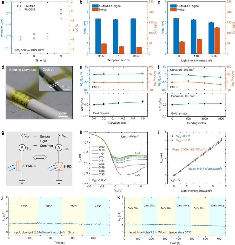 这项研究引入了一种高度兼容、高信噪比的多模态脑机接口系统设计——将硅基晶体管-无源器件集成与单器件功能复用策略相结合。所展示的用于电生理和光强探测的晶体管阵列与温度传感器同时展示了较优异的电//光性能、长期稳定性和生物相容性,模态之间互不干扰。随着未来与多路复用互连方案的结合和温度传感单元的进一步小型化,有望在单个系统中实现三个甚至更多传感功能的阵列。这些设计策略不仅可以促进光刺激期间热效应的研究,还可以为其他脑部疾病的研究提供新的观察维度,例如癫痫病灶定位、肿瘤代谢监测和闭环光遗传学治疗等。总体而言,这些结果和方法有望进一步推进植入式神经接口的大面积、多模态实时监测技术的发展。
