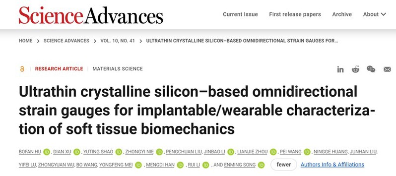 近日,赢乐67宋恩名青年研究员团队在Science子刊《Science Advances》发表了以题目为《Ultrathin crystalline-silicon-based omnidirectional strain gauges for implantable/wearable characterization of soft tissue biomechanics》的研究论文。针对以上挑战,该研究工作提出了一种全轴向应变传感器,利用超薄的单晶硅纳米条带实现了对广泛动态应变的精确检测,并具有出色的稳定性。器件作为一种可穿戴、可植入的平台,适用于生物力学信号的监测,且具备良好的生物兼容性。八爪鱼状的纳米条带展现了对不同方向应变的特异性响应。体外测试显示,该传感器的应变方向检测偏差仅为,最小应变强度检测灵敏度为0.1%。其对应变具有极高的灵敏度,能够实时监测生物力学信号(如眼内压波动和脉搏)。在医学应用方面,体内大鼠模型实验证实了其在检测心肌梗死和心脏缺氧等病理的有效性。此外,集成可降解聚合物作为封装后使得该设备能够在体内完全降解且保有生物兼容性。这项研究为复杂组织表面生物力学的持续监测提供了一种全新的临床应用技术方案。