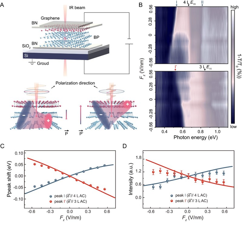 A)器件示意图(上)和偏振光选择激子朝向的示意图(下)。(B)不同电场下90°转角的3+4层黑磷的消光谱的伪彩图,上图(下图)为入射光偏振沿着4层(3层)黑磷AC晶向。
