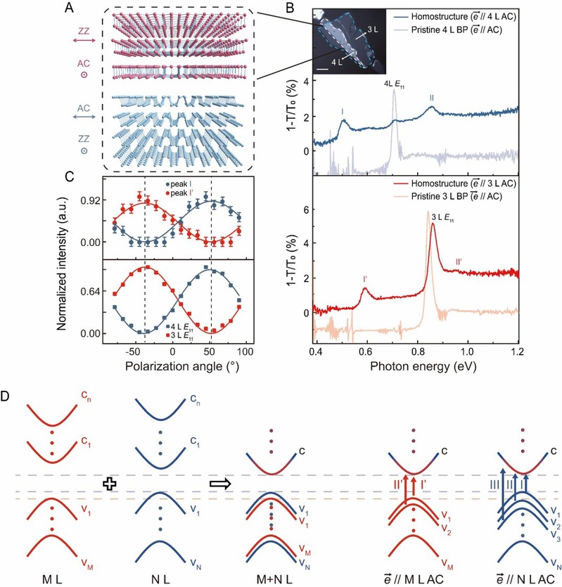 (A)90°转角黑磷原子结构示意图。(B90°转角的3+4层红外消光谱。(C)激子吸收强度的偏振角度依赖关系。(D90°转角黑磷的能带结构示意图。