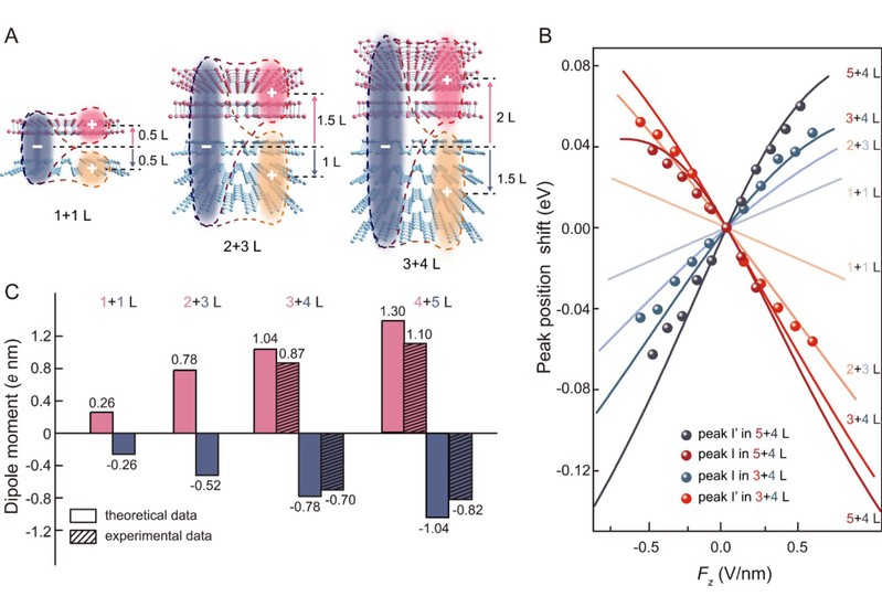 A)晶格结构与偶极激子的示意图。(B)不同层厚中的偶极激子在电场下的斯塔克位移。(C)不同层数组合中的电偶极矩大小。