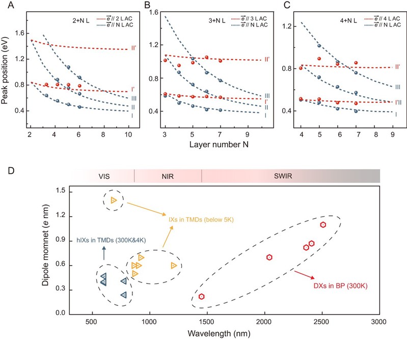 A-C)不同层数组合中偶极激子的共振能量。(D)二维范德瓦尔斯异质结、同质结中偶极激子的共振能量和电偶极矩大小的分布情况。