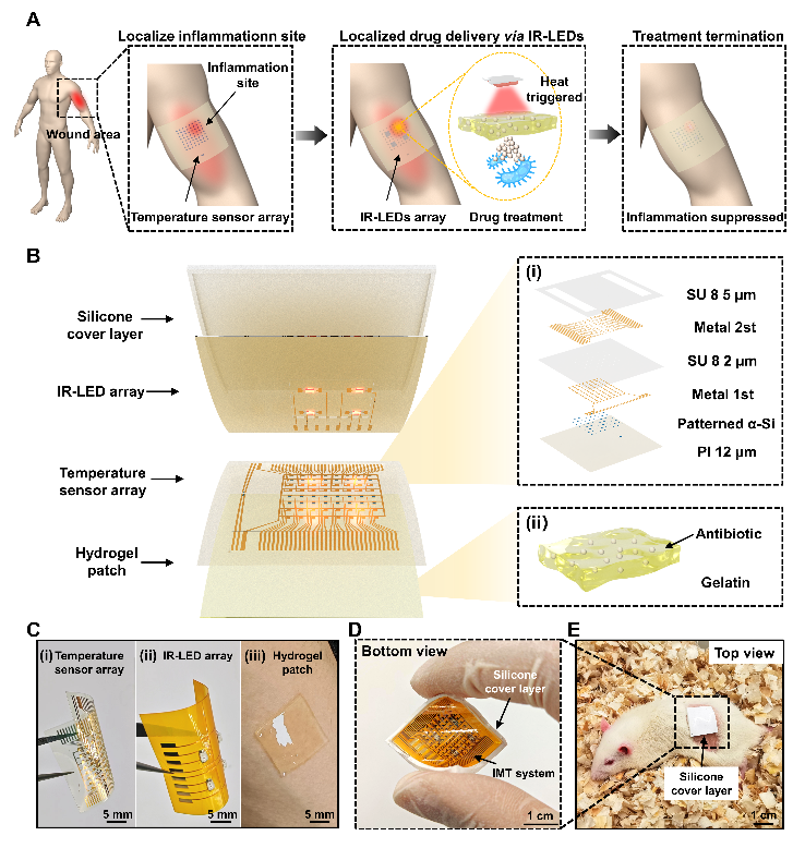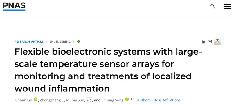 近日,宋恩名/梅永丰课题组提出一种可扩展的柔性保形器件平台(IMT),集成了硅薄膜温度传感器阵列、红外发光二极管矩阵和载药水凝胶贴片,用于监测生物体伤口组织的空间炎症分布并提供药物局域定位治疗,为临床应用和居家医疗中伤口组织的持续监测与治疗反馈提供了解决方案。相关研究成果以“Flexible bioelectronic systems with large-scale temperature sensor arrays for monitoring and treatments of localized wound inflammation”为题发表于PNAS。