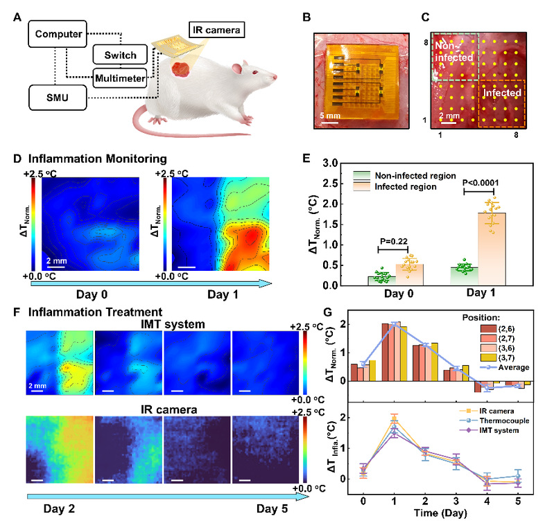 在动物实验过程中,研究团队在大鼠伤口验证了局域炎症监测与治疗的功能。伤口局部感染造模后,短期内观察到感染区域存在显著的温度上升,对应于炎症加剧。释药完成后的数日,伤口范围内的温度场分布逐渐归于均一,代表炎症的缓解直至消失。同时,该系统对伤口组织的组织学和免疫组化分析显示,经过IMT治疗的伤口具有更快的回复速率和更低的炎症水平。生物相容性实验结果中没有观察到明显的生物排异反应。