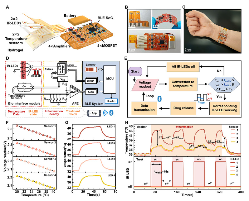 研究团队开发了与其匹配的智能无线自动控制模块,在无人为干预的条件下自动处理炎症温度数据并进行释药反馈操作,为日常伤口炎症定位与治疗提供了可行的方案。基于此,该IMT系统可实现亚毫米级别精度的炎症定位与监测、无线数据传输和自动化治疗功能的智能伤口管理系统,在闭环伤口管理的日常监测场景中具有关键优势。