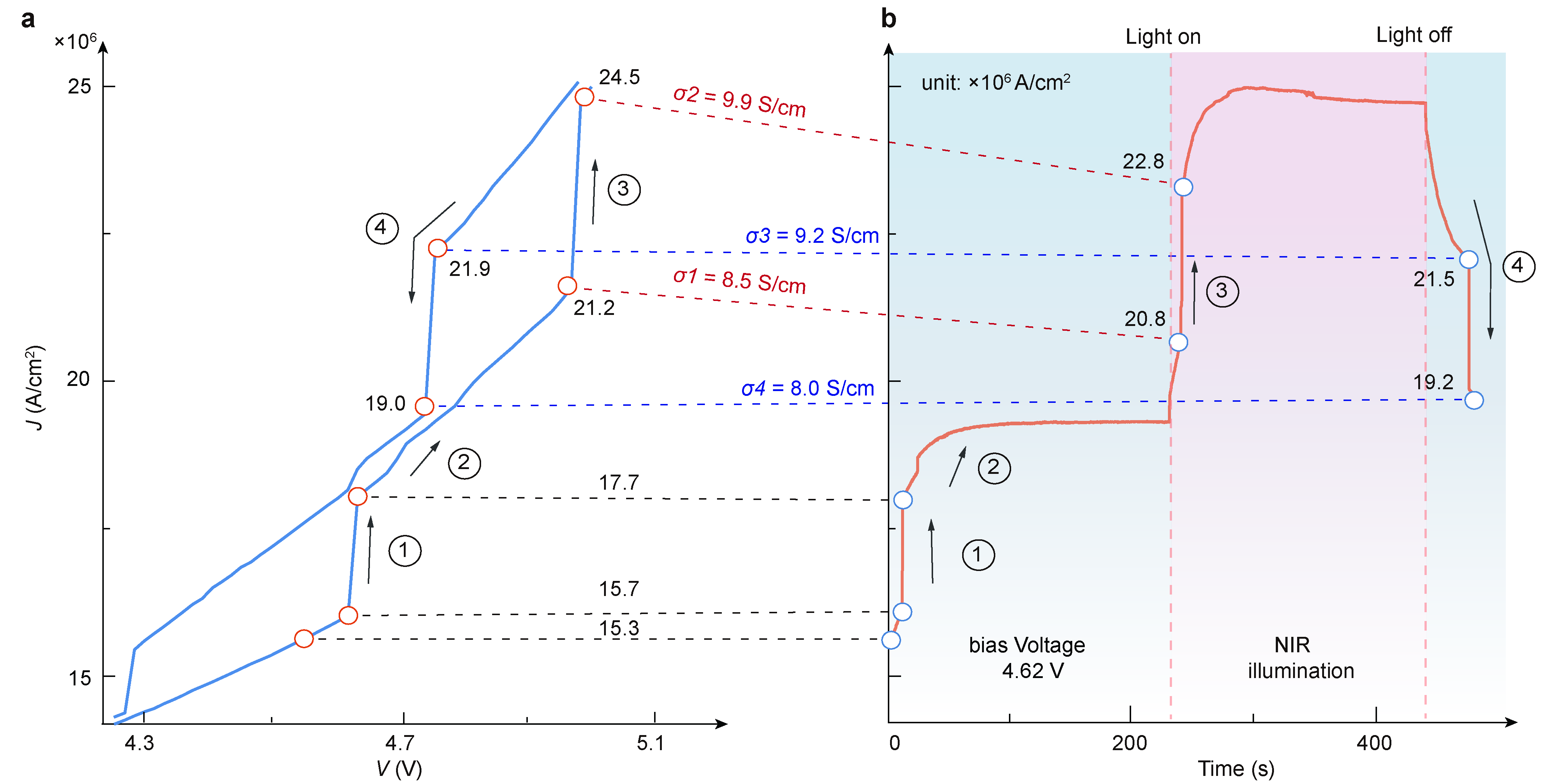 基于以上发现,研究发现可以通过调节偏置电压以及红外光照条件,可以精确控制材料局域热效应以实现动态调控其相变过程,从而实现针对红外光的高响应度探测,为设计基于电荷密度波相变机制的红外光电探测器件提供了新的思路。